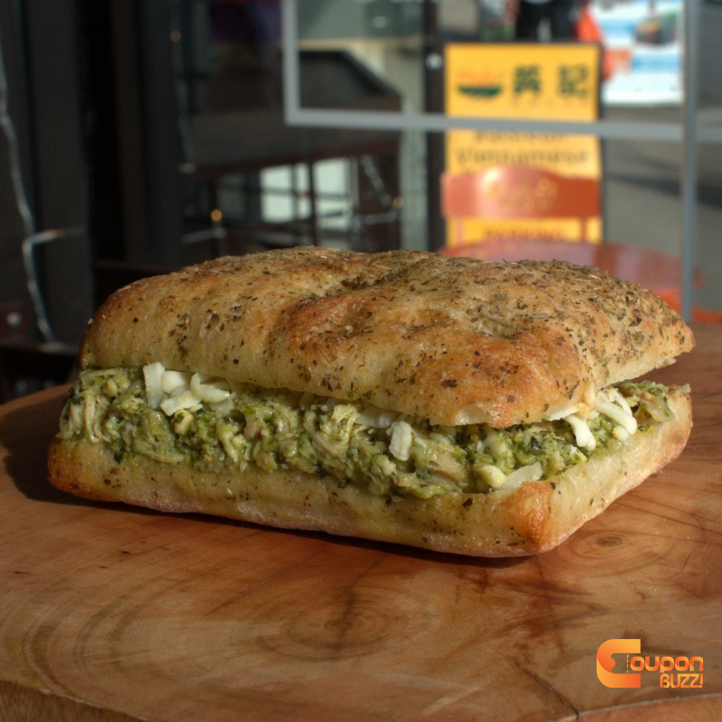 ساندویچ چیکن پستو (Chicken Pesto) جذاب ما همراه با یک گرین سالاد کوچک سرو میشود.