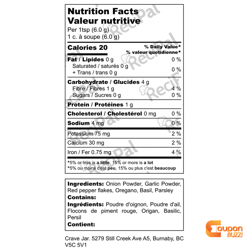 Ingredients: Aromatic herbs (pennyroyal, basil, parsley, etc.), garlic granules, onion granules, red pepper (this product is not spicy).