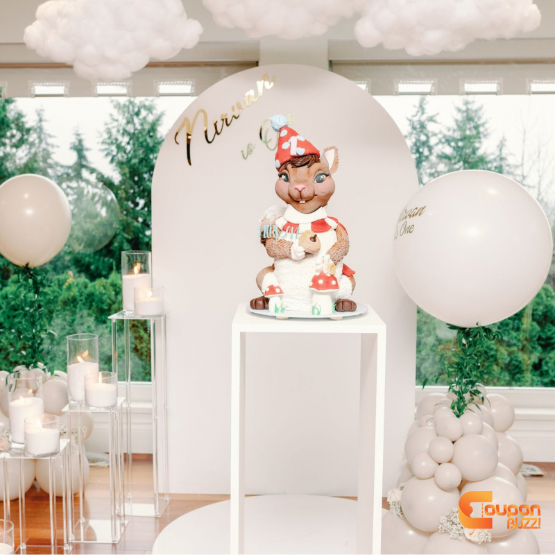 Handmade bear cake frame, backdrop, cake stand, and event-appropriate lettering.