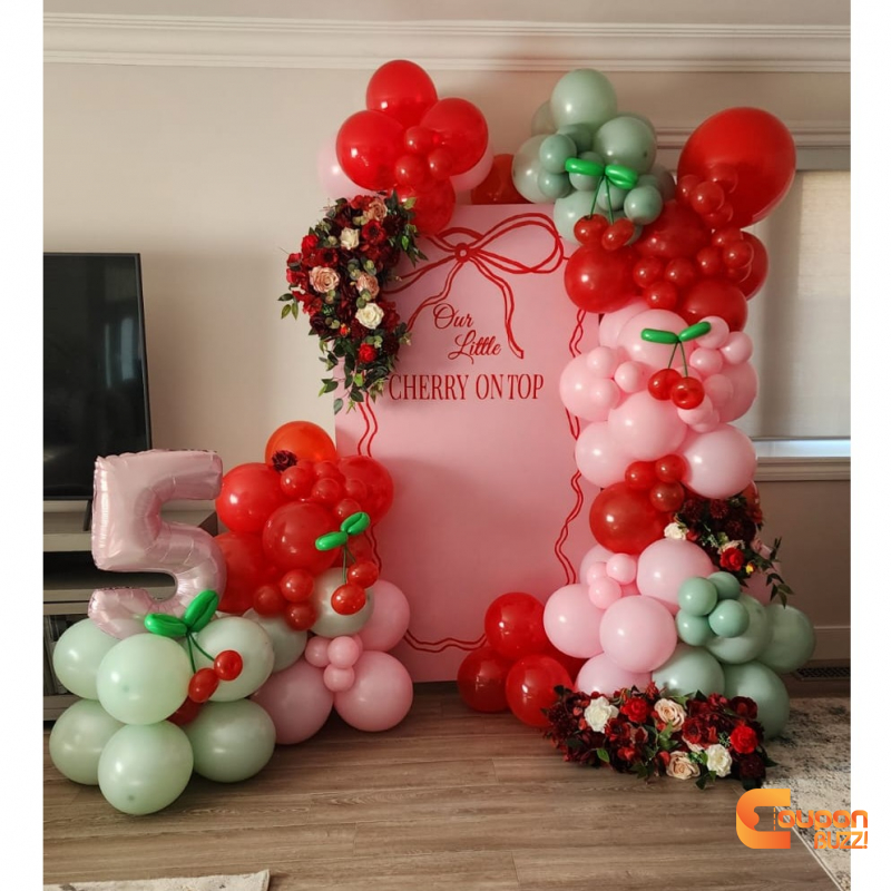 One Backdrop with balloon decorations, custom letter.