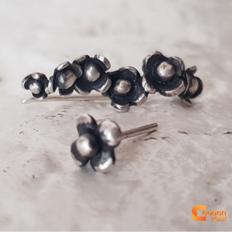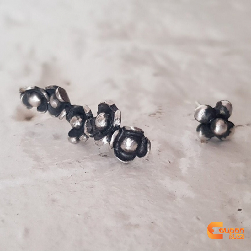 These stunning silver climber earrings are designed to elevate your jewelry collection with their graceful floral patterns. The large flower features *a wire at the back that allows it to be securely held onto your ear,* creating a captivating, nature-inspired look. The second pair of earrings are classic studs, offering a more traditional but equally elegant option. The delicate floral designs follow the natural curve of the ear, making these climbers a beautiful statement piece. Perfect for adding a touch of elegance to any outfit, these earrings are crafted with attention to detail and quality.