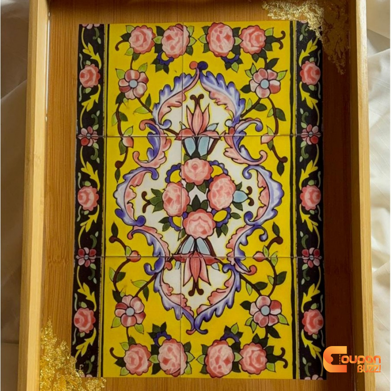 سینی ایرانی با طرح کاشی، ساخته شده از چوب بامبو، رزین و ورق طلا.