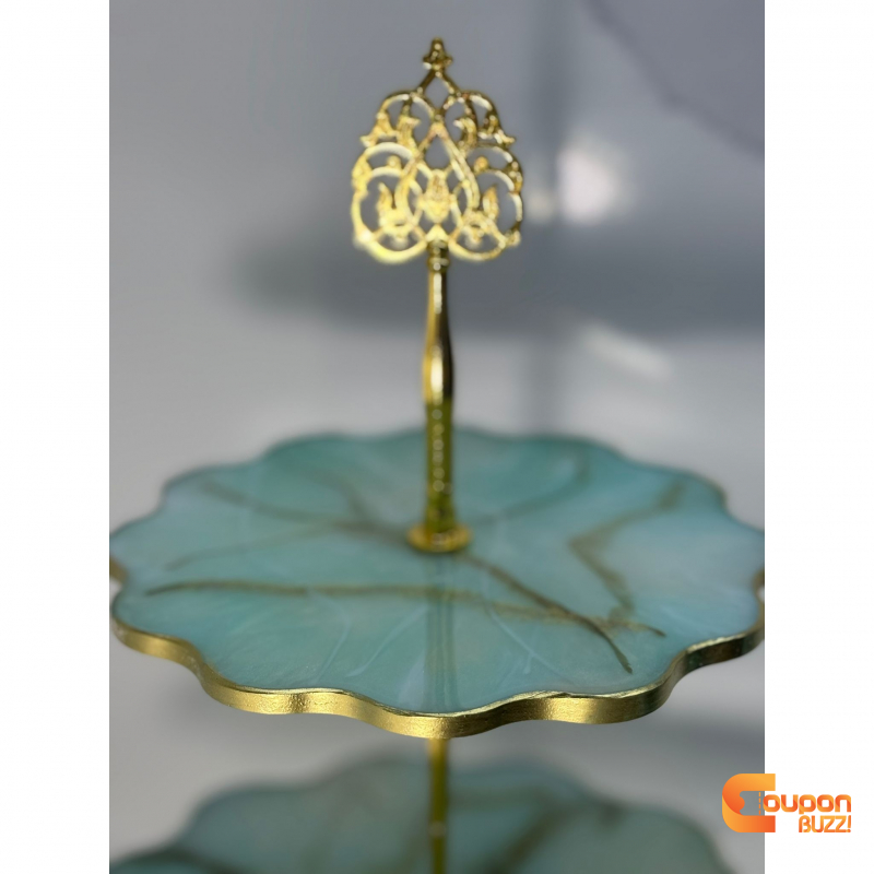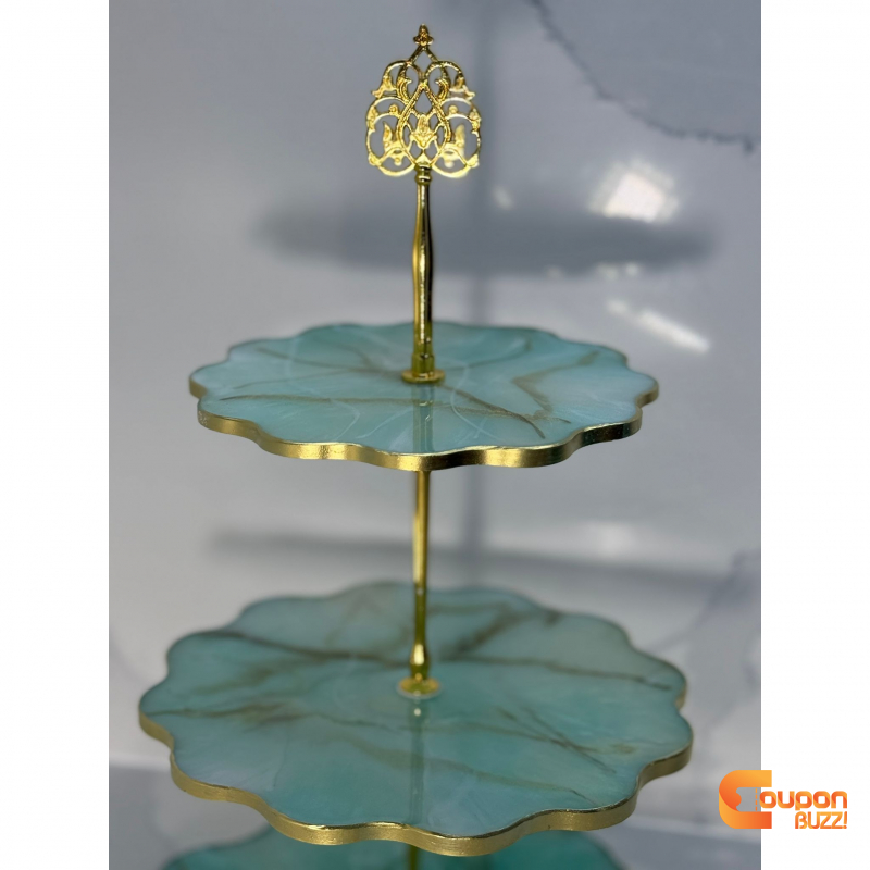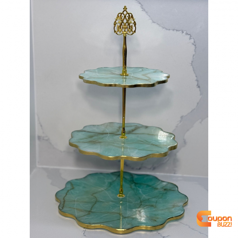 استند سه طبقه مناسب سرو کیک و شیرینی و دسر ، طرح مرمر فیروزه ای دستساز.